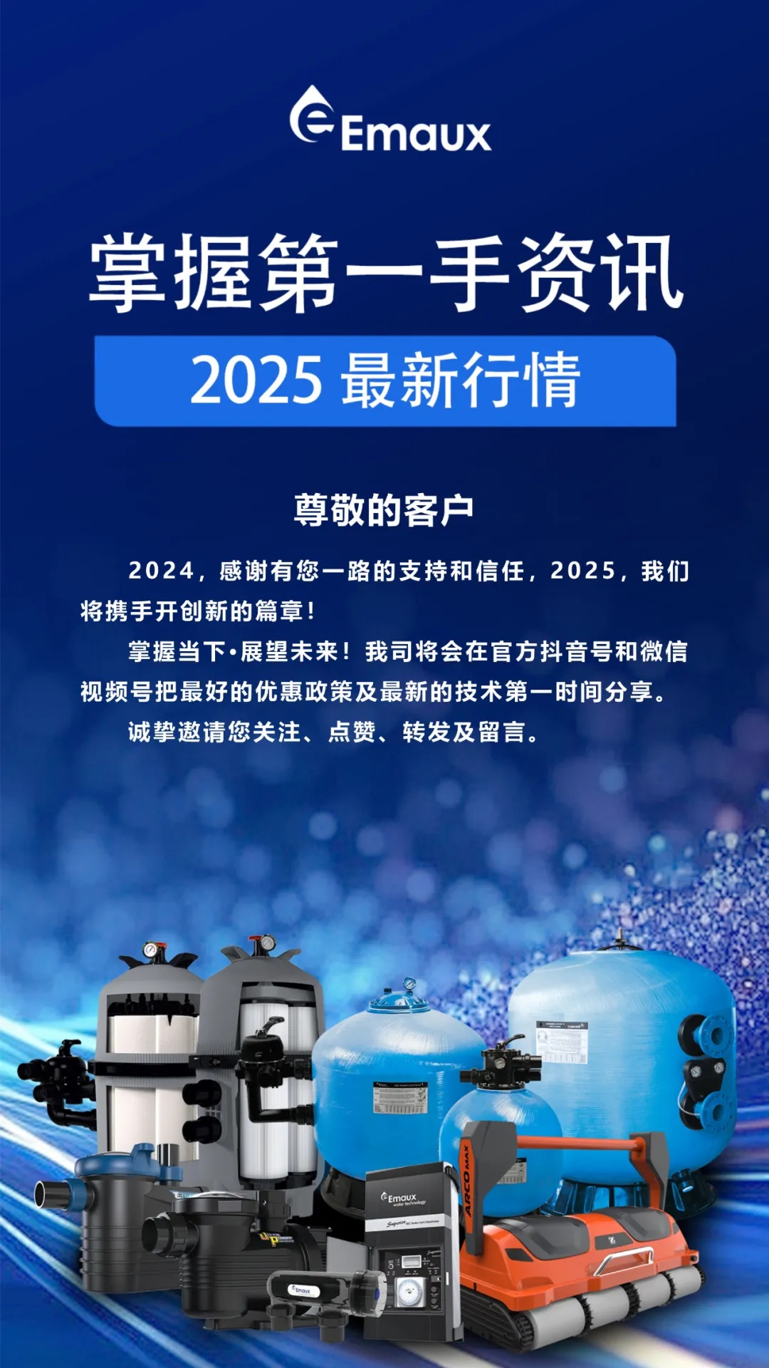 意萬仕集團(Emaux Group),國際水處理行業領軍企業之一,我們在游泳池行業擁有40多年豐富的知識,是一家用心為您提供泳池設備解決方案的專業生產商, 為全球十大泳池設備供貨商之一。 集團擁有超過10萬平方米的生產基地,集研發(fā)、生產、質量控制、培訓, 銷售和售后支持于一體,確保我們的工廠能夠為客戶提供多樣化和創新的泳池和各類水處理設備,滿足高標準的質量,性能和設計.